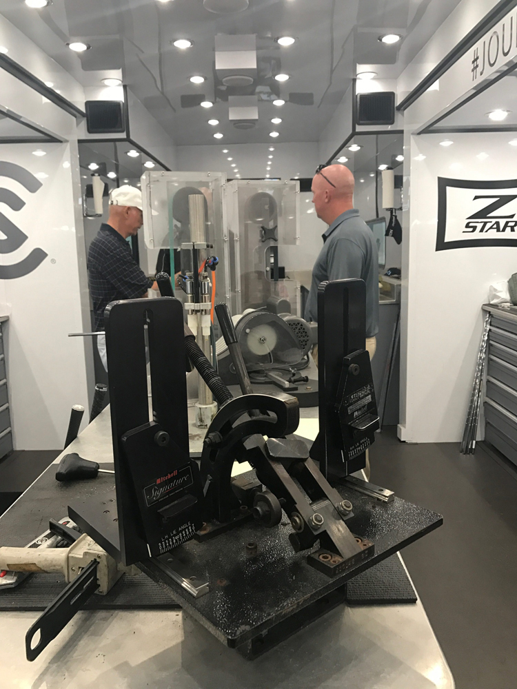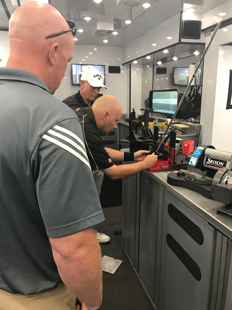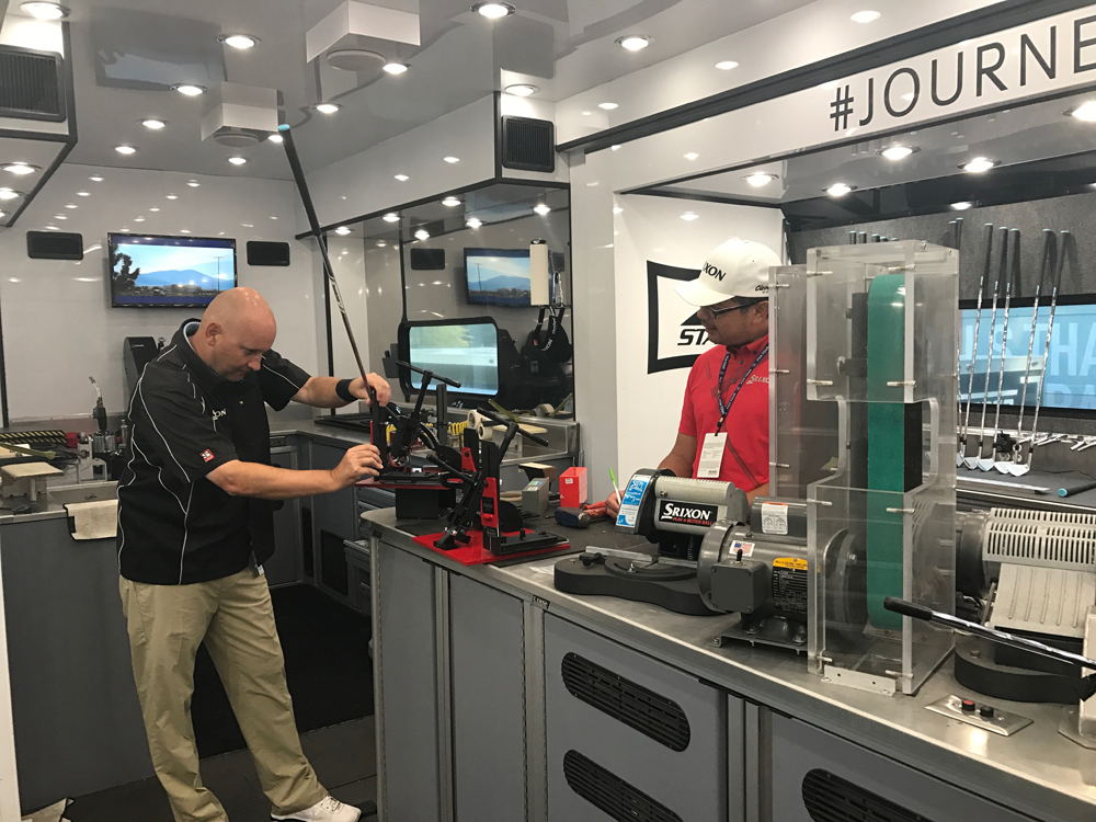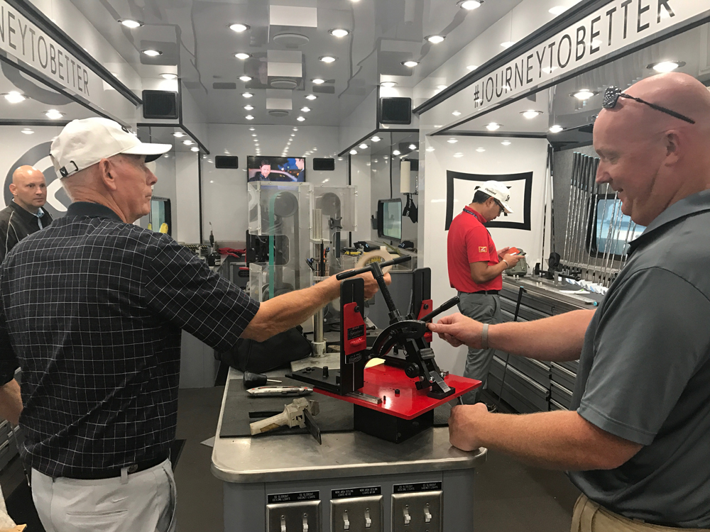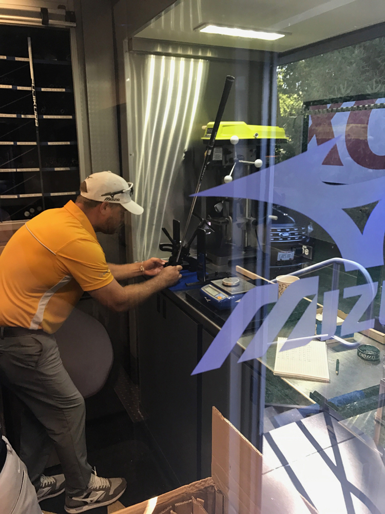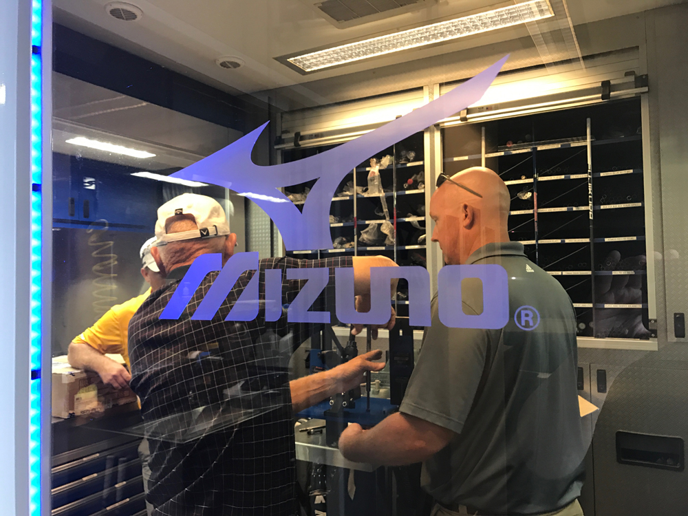 Ed Mitchell and owners Andrew and Stephanie Dobbins visited the WGC Bridgestone Invitational in Akron, Ohio, this week to meet with PGA tour van technicians and install new equipment. The Mizuno tour van replaced its machine with a Steelclub® Signature Irons Angle Machine in their Mizuno blue. The Cleveland/Srixon tour van replaced two machines with Srixon red Steelclub® Signature Irons Angle Machines.